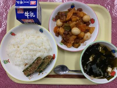 (献立): ごはん、牛乳、竹輪のゆかり揚げ、磯和え、生揚げと野菜のカレー煮込み