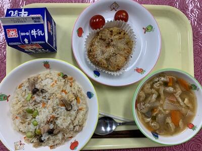 (献立): とりめし、牛乳、プレコロッケ、ミニトマト、味噌汁