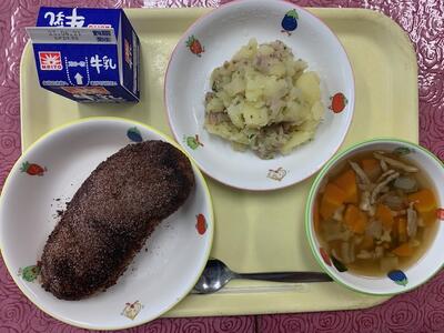 (献立): ココア揚げパン、牛乳、ジャーマンポテト、お星さまのパスタスープ