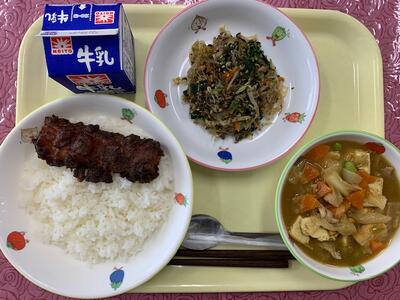 (献立): ごはん、牛乳、ししゃものカレー揚げ、胡麻酢和え、五目豆腐