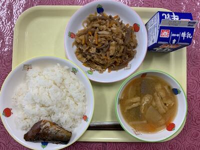 (献立): ごはん、牛乳、鯖の甘露煮、切干大根の煮物、味噌汁