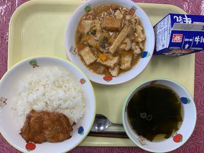 (献立): 麻婆丼、牛乳、中華スープ、さつま芋の黒蜜がけ