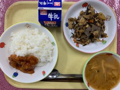 (献立): ごはん、牛乳、鶏肉の甘酢あんかけ、野菜の磯煮、味噌汁