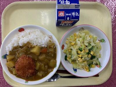 (献立): チキンカツカレーライス、牛乳、コーンのサラダ