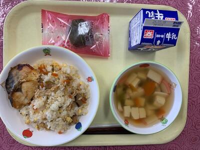 (献立): いわしごはん、牛乳、野菜の磯煮、味噌汁