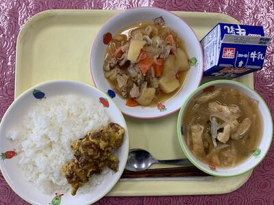 (献立): ごはん、牛乳、ちくわのカレー揚げ、肉じゃが、味噌汁