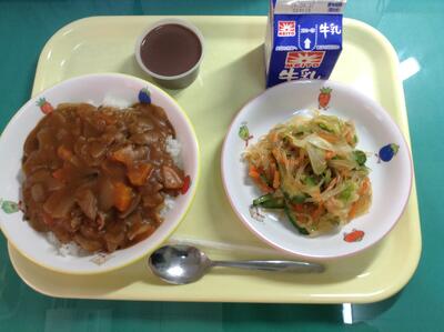 ハヤシライス、春雨サラダ、豆乳ココアプリン、牛乳