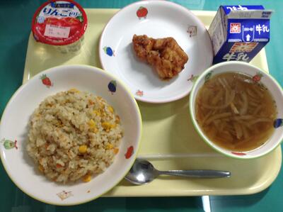 メキシカンライス、鶏肉のレモン煮、オニオンスープ、りんごゼリー、牛乳