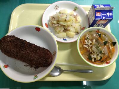 ココア揚げパン、ジャーマンポテト、お星さまのパスタスープ、牛乳