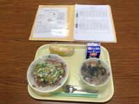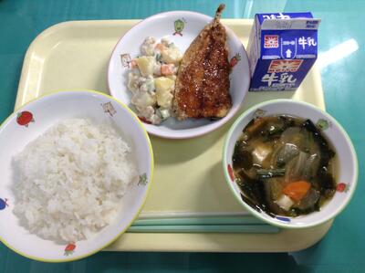 ごはん、イワシの蒲焼き、まめじゃがサラダ、味噌汁、牛乳