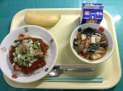 ↑ 大洲中学校のごはん(一番奥)、タコライスのサラダ(奥から2番目)、タコライスのソース(奥から3番目)、