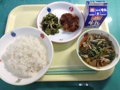ごはん、メンチカツ、わかめの酢の物、沢煮椀、牛乳