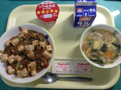 マーボー丼、中華風コーンスープ、ヨーグルト、牛乳