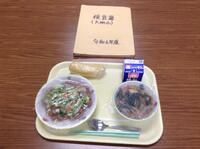 春雨スープ(一番手前)を一斉に配缶(各クラスの容器に入れる)しています。この後に大洲小学校の