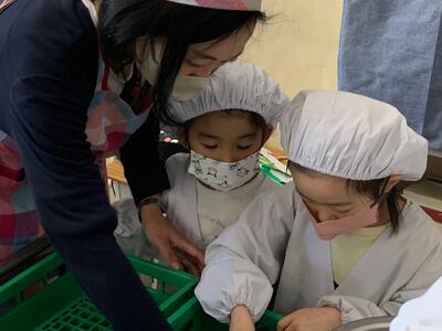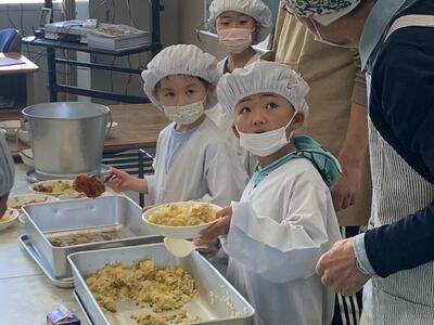 給食当番の子どもたちは、真っ白な給食着に身をつつみ、先生から配膳の仕方を教わりながら準備をしました。