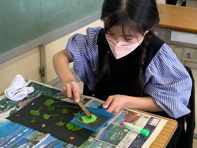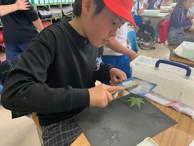 葉や花、切り抜いた型を画用紙に置いて、その上からブラシでシャカシャカしました。