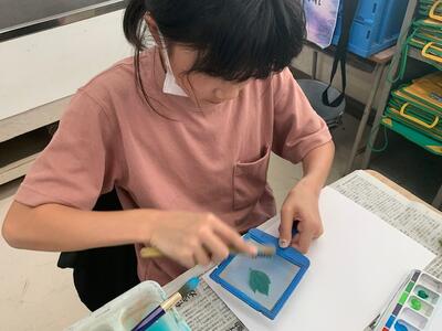 今日は「スパッタリング」という絵の具を使った技法で作品をつくりました。