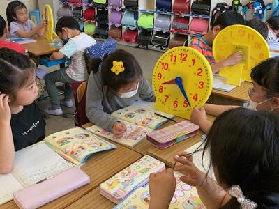 子どもたちは、朝起きる時刻、家を出る時刻、学校へ着く時刻などから、「何分かかったか?」という問題を考えました。