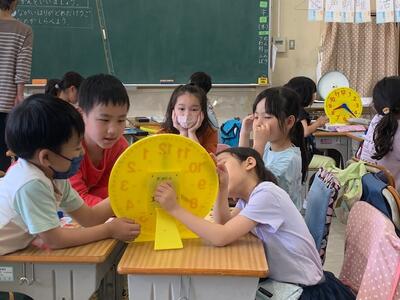 4年生は、折り紙と割り箸で丸く開く扇を作り、その扇を動かすことで角の大きさを確かめていました。