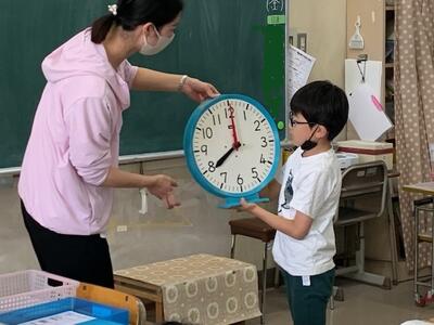 1年生のときには、「何時、何分か」を時計の針を見て読めるように学習しました。ここでは、時刻と時刻の間、つまり「時間」を生活に生かせるように学習していきます。