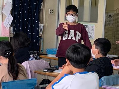 「大洲小の校庭は広くて遊具がたくさんあって楽しいです。」「給食がおいしいです。」「友だちもたくさんできました。」「今日はありがとうございました。」