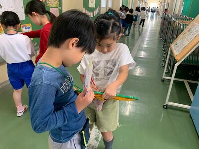 1年生と2年生のペアは、計画にしたがって、時間の許す限り学校内をまわりました。