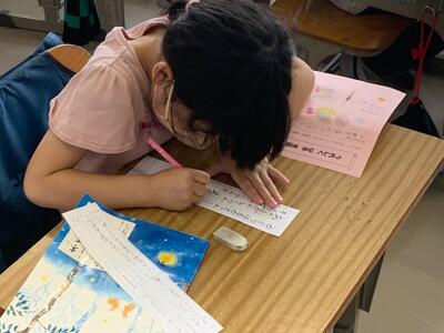 「〇〇さんのすてきなところは、やさしいところです。体育のときに『だいじょぶ?』とはげましてくれました。」