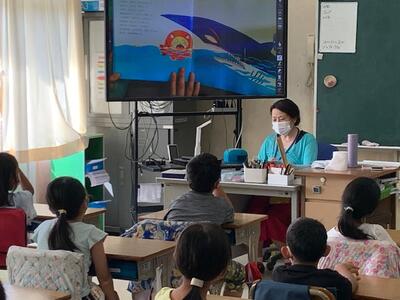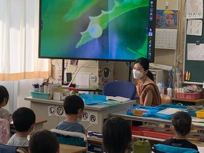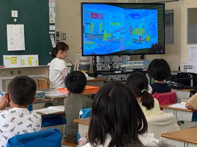 子どもたちは、絵を食い入るように見ながら、お話に聞き入っています。