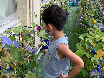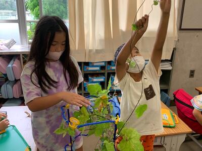 つるもだいぶ伸び、巻きついていた支柱からはみ出しながら元気に成長しています。伸ばしてみると子どもたちの背丈より長くなっています。大きな葉もいっぱいです。力強さを感じます。