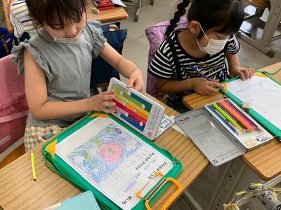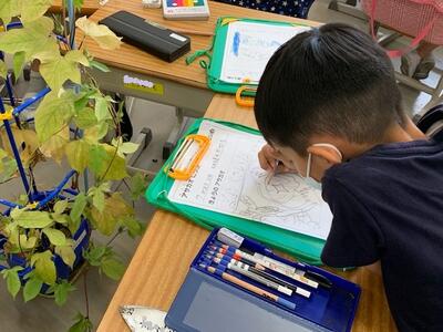 1年生が、教室でアサガオの観察をしていました。アサガオ日記もこれで6枚目になります。