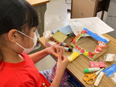 写真立て、ペン立て、小物入れ…。何を作るか事前に考え、空き容器やコップ、紙パックを持ってきました。モールやビーズ、ボタンを持ってきている子も。