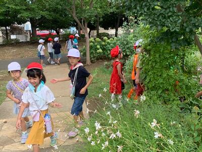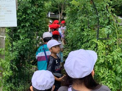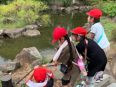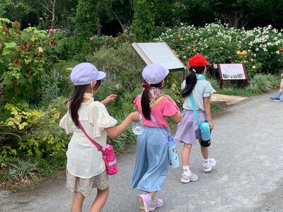 「バラの花がきれいだったよ。」「池があったよ。」「コイがたくさん泳いでいた。」「カメがいたよ。」いろいろな発見がありました。