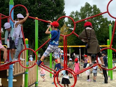 公園には、遊ぶための遊具だけではなく、ベンチや屋根のついた休憩場所、トイレ、防災倉庫など、様々なものがあります。どんなものがあるのか、何のためにあるのか、事前に学んだことを目で見て確認しました。