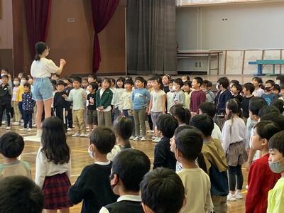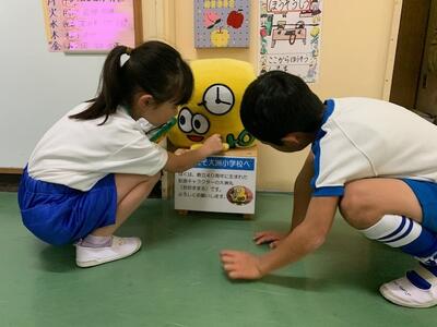 「大洲小の校庭は広くて遊具がたくさんあって楽しいです。」「給食がおいしいです。」「友だちもたくさんできました。」「今日はありがとうございました。」