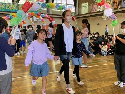 6年生が1年生をエスコートして入場。