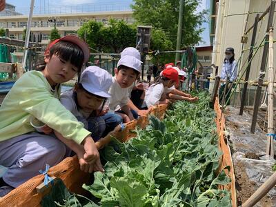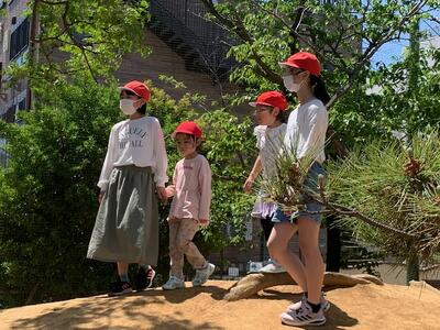 木々の葉の緑も鮮やかです。花壇にはたくさんの花が咲いていて、とてもきれいです。木漏れ日が注ぐワンパク山の木の下や、吹く風の中など、たくさんのものから季節を感じ取っていたようです。
