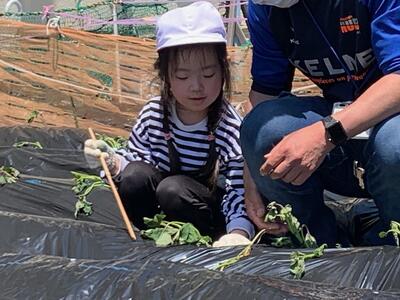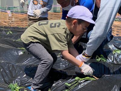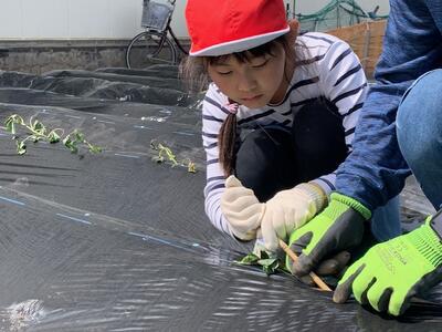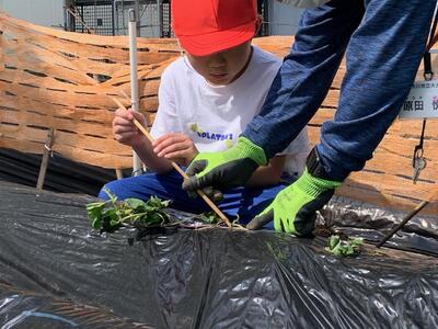 黒いビニールでおおわれた畝に、竹でできた道具をあて、穴をあけながら苗を植え付けます。1人2本ずつ植えました。
