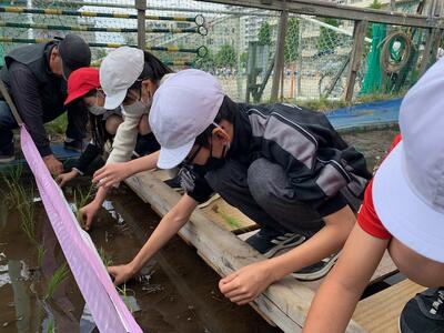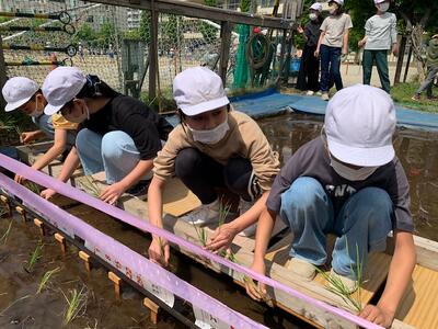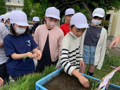 米作りに携わる方々の様々な工夫や苦労など、実感をともなう深い学びにするため、例年、田植え体験をします。