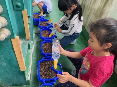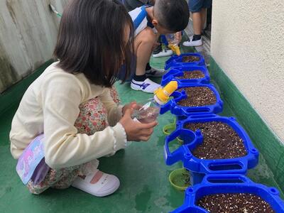 鉢をベランダにならべた後、「大きく育ってね」と、気持ちを込めながらペットボトルのじょうろで水やりをしました。元気に育ってほしいものです。