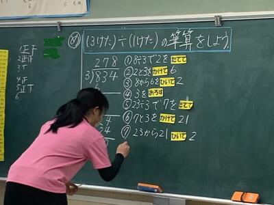 「たてる・かける・ひく・おろす」の順で計算する筆算のやり方を、全員で確認していました。