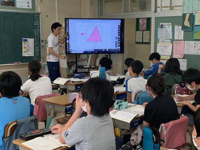 今日は、(a×8)÷2 ,a×(8÷2) ,(a÷2)×8 の文字を使った式3つを読み取り、それぞれ、どのように三角形の面積を求めたかを考えました。
