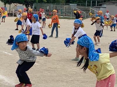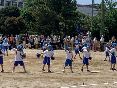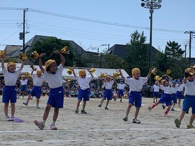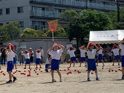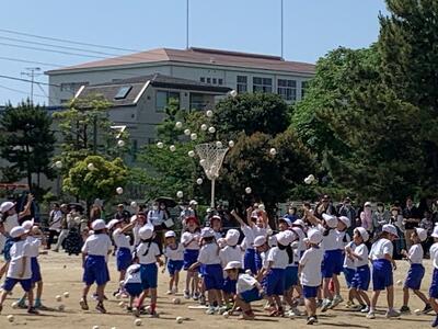 1年生は「玉入れ」の競技です。リズミカルにダンスをしてからの玉入れです。とてもかわいいです。