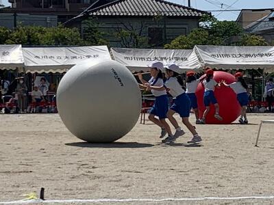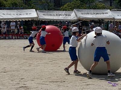 2年生は「大玉ころがし」です。背丈よりも高い大玉です。2年生の子どもには、さぞ大きく見えると思います。