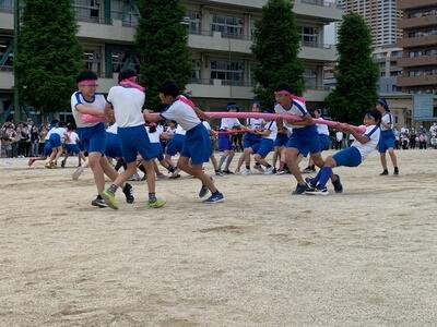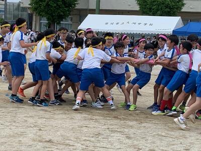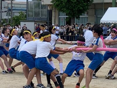 徒競走のあとは団体競技です。4年生は「綱引き」、5年生は「追いかけ玉入れ」、6年生は「棒引き」です。