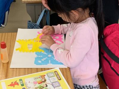 偶然できた形のおもしろさを感じとったり、友だちと見せ合ったりして楽しく取り組んでいました。