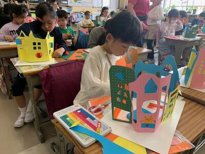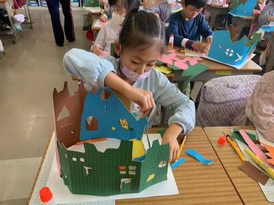 「やどかりのおひっこし」(絵本)のお話を聞いて、どんな素敵なおうちがいいか想像を膨らませながら描きました。