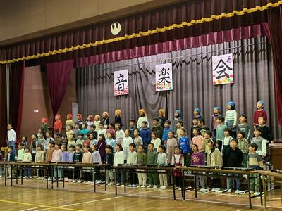 1年生は初めての音楽会です。「青い空に絵をかこう」を元気いっぱいに歌いました。さらに「子犬のマーチ」を、鍵盤ハーモニカや鉄琴、カスタネット、すずなどで演奏しました。
