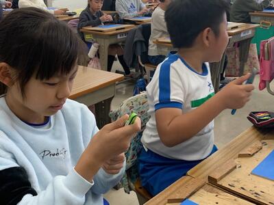 ドングリを竹ひごでつないで「やじろべえ」づくりに挑戦する子もいました。ドングリの側面に穴をあけるのは難しですね。