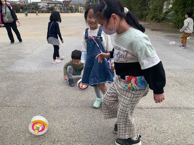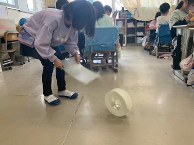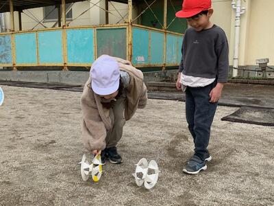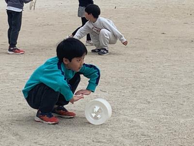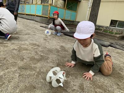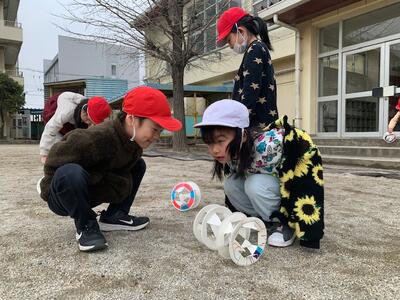 校庭に出て風輪を転がしてみることにしました。あいにく今日は無風です。