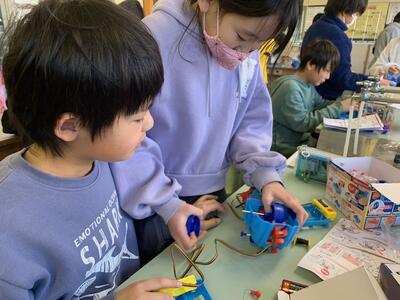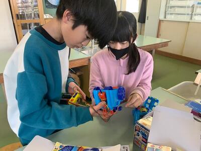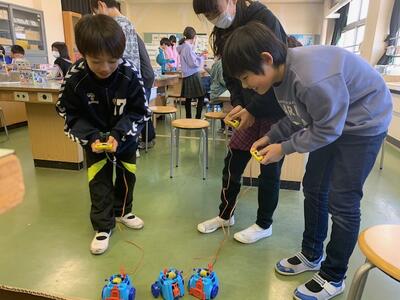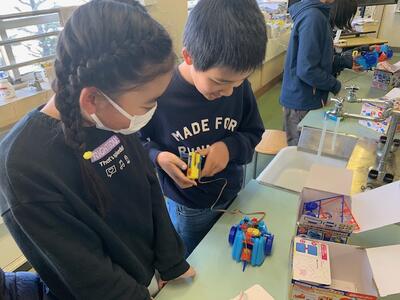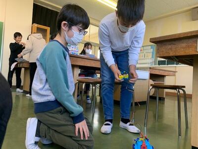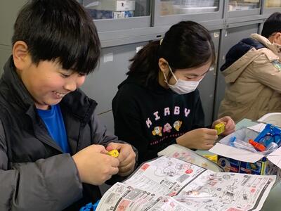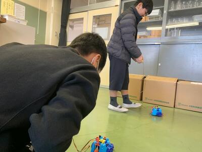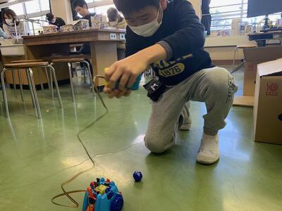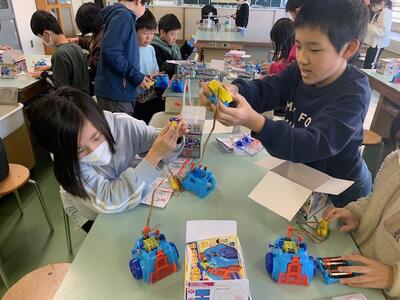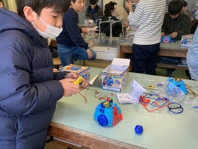 学習後は、電磁石を使った「フットサルロボ」を組み立て、みんなで遊びました。